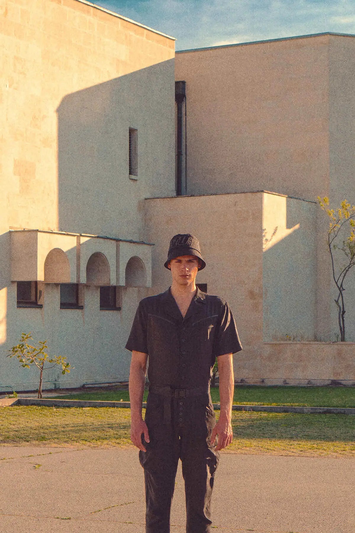 Utility Jumpsuit with Spread Collar and Adjustable Belt